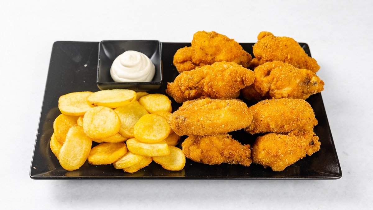 6 kosov ocvrtih perutničk, 6 kosov perutničk z domačim mehiškim posipom, 8 kosov piščančjih medaljonov, 8 kosov čebulnih obročkov, 8 kosov mozzarella palčk, krompirček