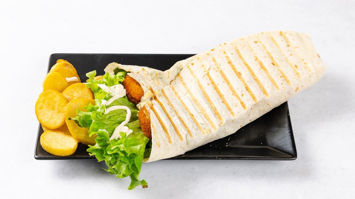Glavna sestavina po izbiri, tortilja, ketchup, majoneza, sir, solata, paradižnik, paprika, zelje, vse skupaj zapečeno, in krompirček ter čebulni obročki
