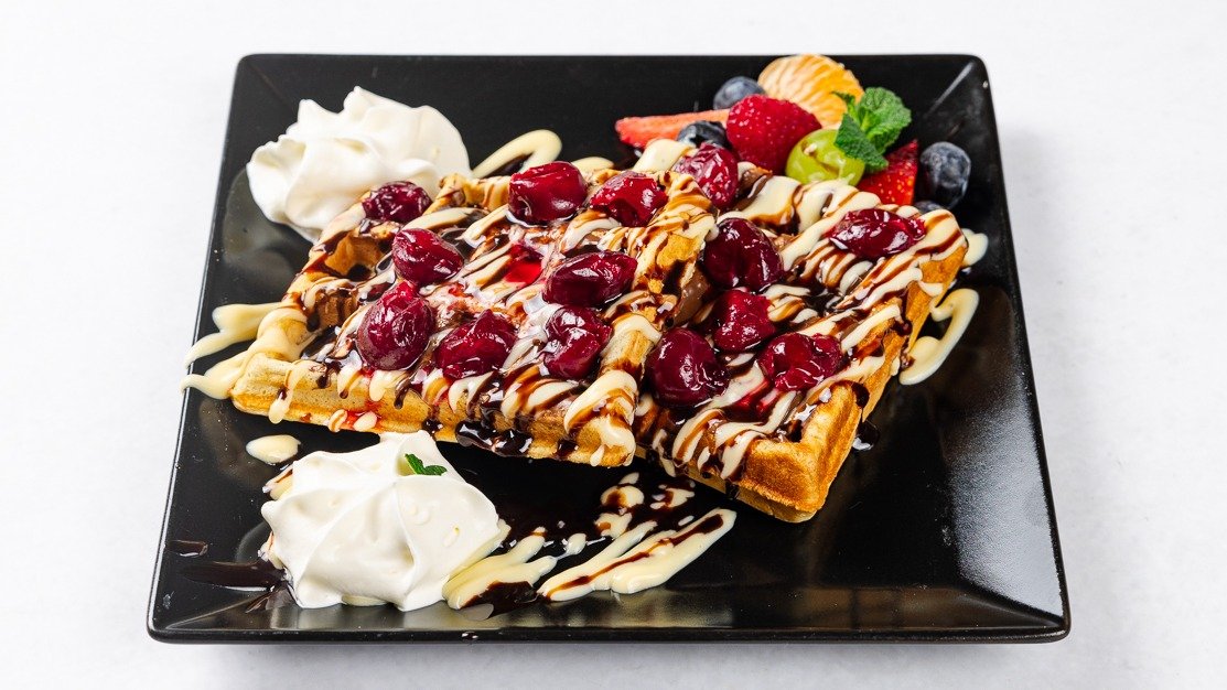 Vafelj, nadev po izbiri, vanilijeva krema, smetana, sveže sadje V ceno jedi je všteto doplačilo 0.70 eur za bio razgradljivo embalažo