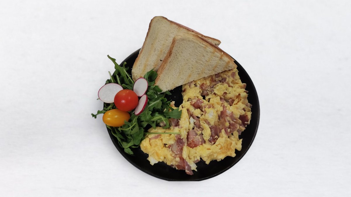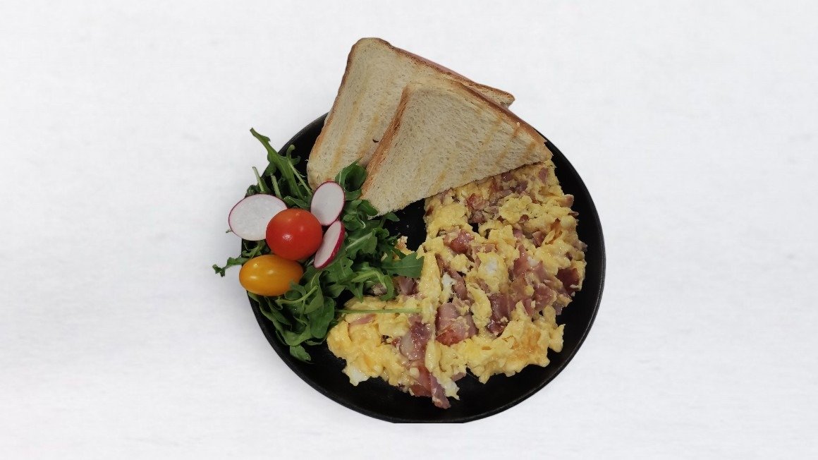 Umešana jajčka s sirom in šunko, toast po izbiri, sveža zelenjava. V ceno jedi je všteto doplačilo 0,70€ za bio razgradljivo embalažo.