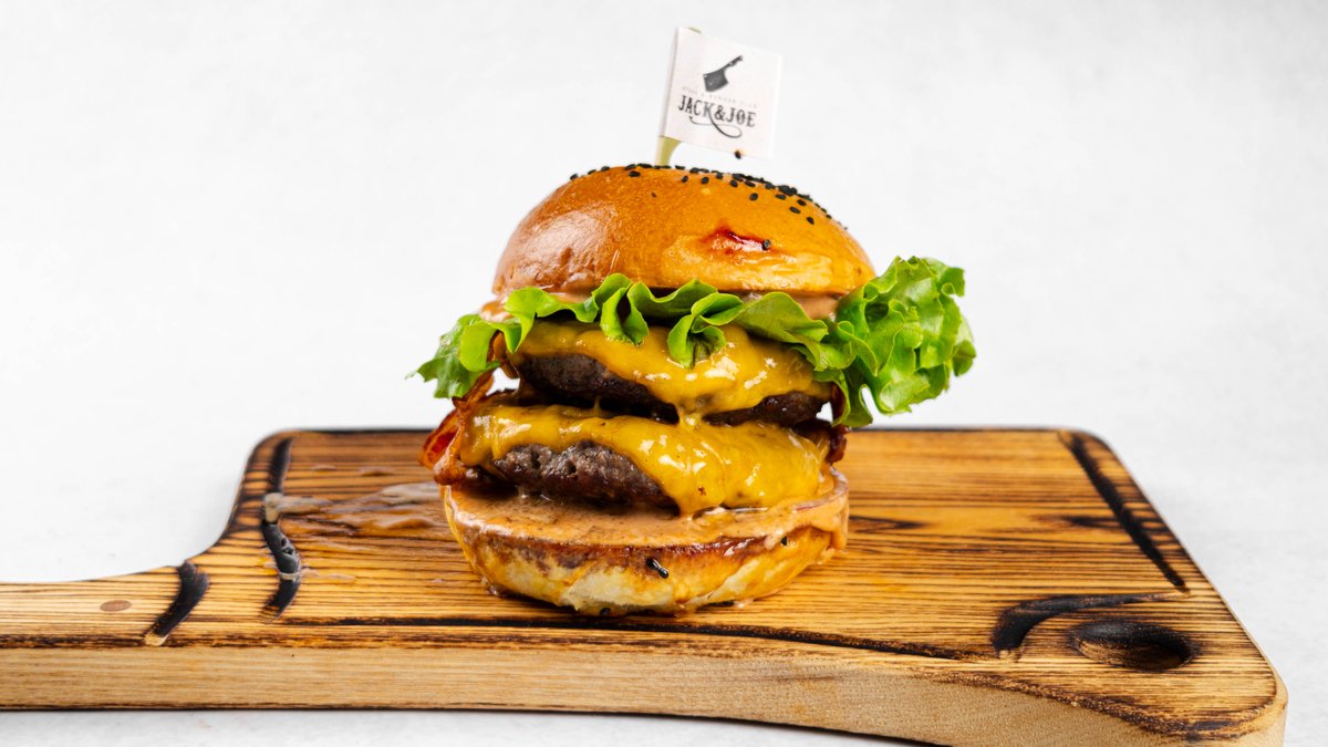 Hlebček, 2x "smash" hrustljava pleskavica iz zorjene slovenske govedine, 2x cheddar sir, 2x slanina, hišna omaka, popečena čebula, kisle kumarice V ceno jedi je všteto doplačilo 0.70 eur za biorazgradljivo embalažo