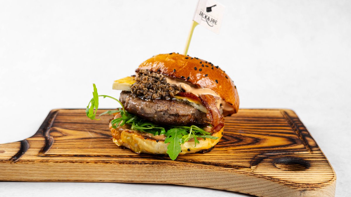 Črn hlebček, meso, rezine pljučne na žaru, tartufi, tartufata, cheddar sir, omaka, hrustljava slanina, omaka, rukola V ceno jedi je všteto doplačilo 0.70 eur za biorazgradljivo embalažo