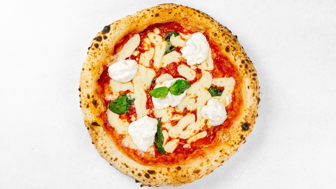 Pelati, fior di latte mozzarella, burrata DOP, parmezan, bazilika, olivno olje V ceno jedi je všteto doplačilo 1 eur za biorazgradljivo embalažo