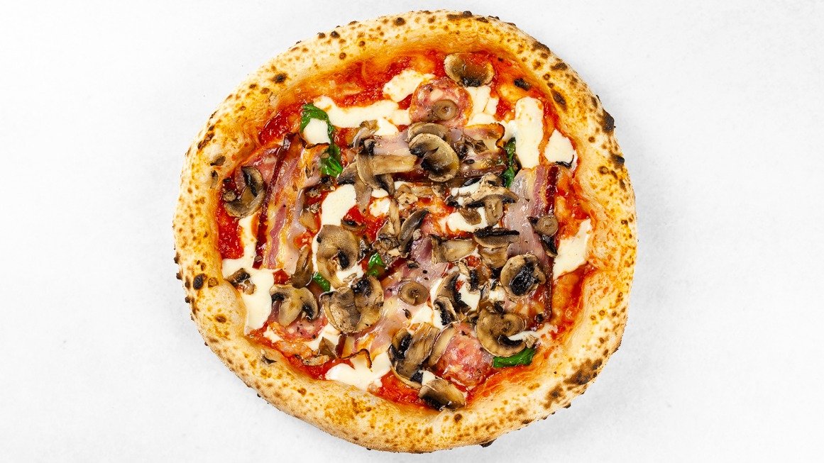Pelati, fior di latte mozzarella, salama, panceta, šampinjoni, Grana Padano, bazilika V ceno jedi je všteto doplačilo 1 eur za biorazgradljivo embalažo