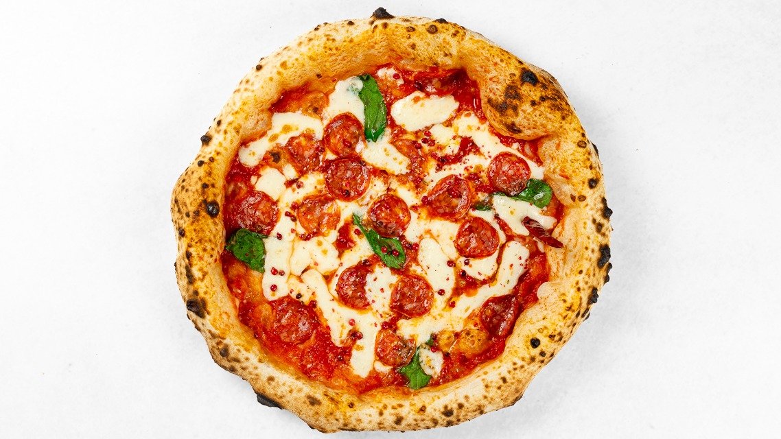 Pelati, fior di latte mozzarella, pekoča salama, rdeči in črni poper, parmezan, olivno olje, bazilika V ceno jedi je všteto doplačilo 1 eur za biorazgradljivo embalažo