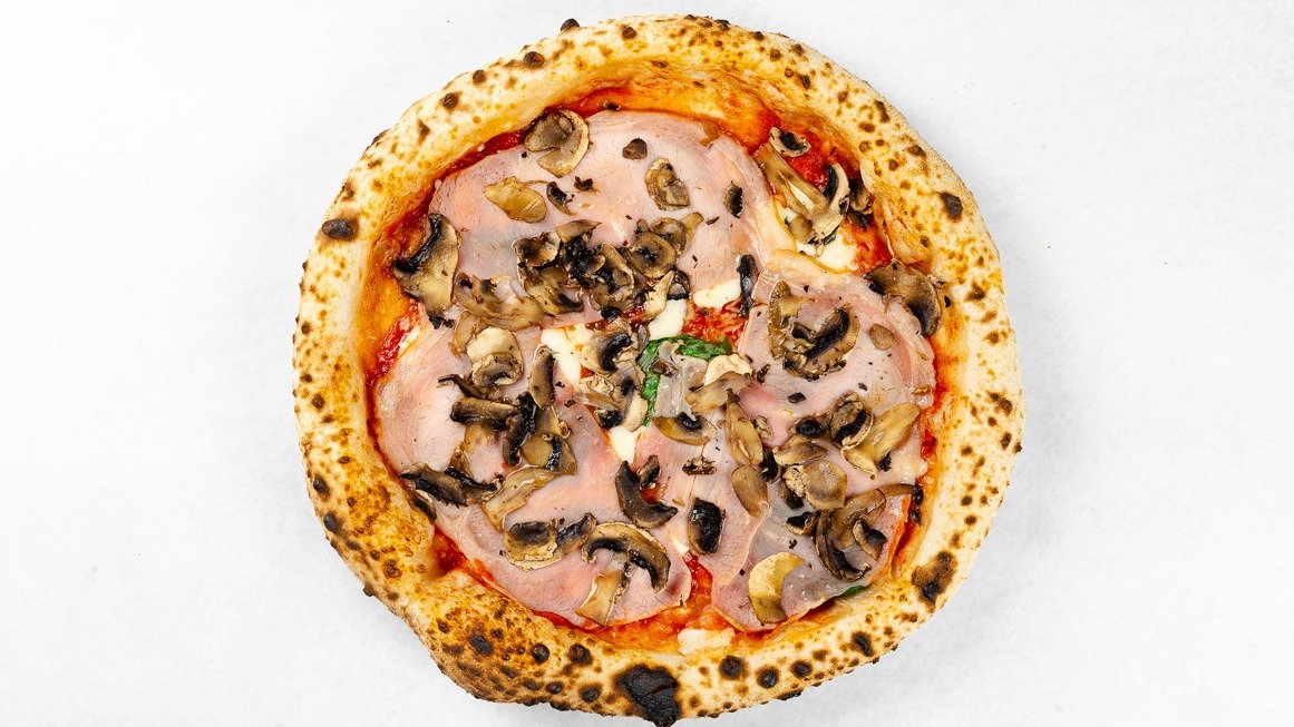 Pelati, fior di latte mozzarella, kuhan pršut, šampinjoni, bazilika V ceno jedi je všteto doplačilo 1 eur za biorazgradljivo embalažo