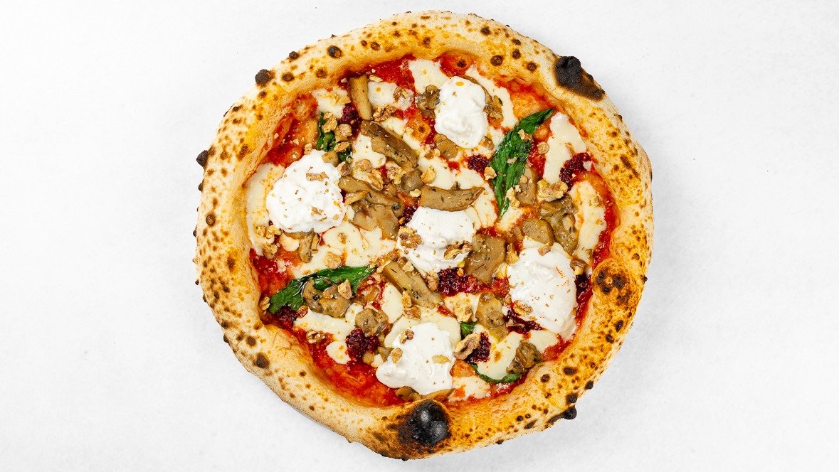 Pelati, fior di latte mozzarella, jurčki, Grana Padano, nduja (kalabrijska sušena mazava klobasa), orehi, burrata, bazilika, olivno olje V ceno jedi je všteto doplačilo 1 eur za biorazgradljivo embalažo