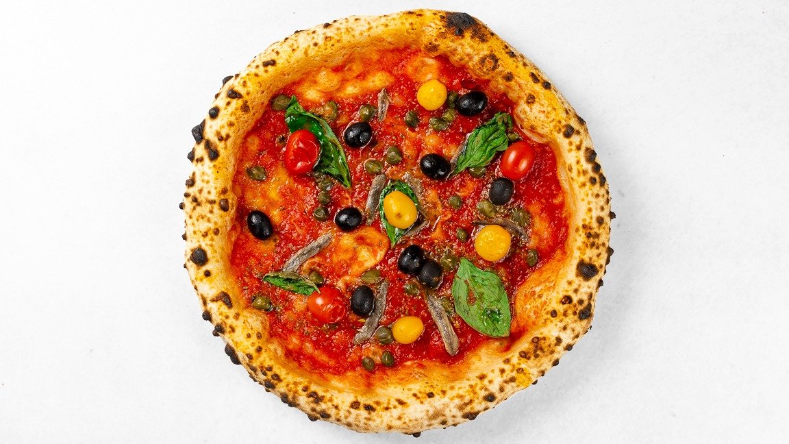 Pelati, česen, inčuni, pomodorini, čili, bazilika, origano, kapre, olivno olje V ceno jedi je všteto doplačilo 1 eur za biorazgradljivo embalažo