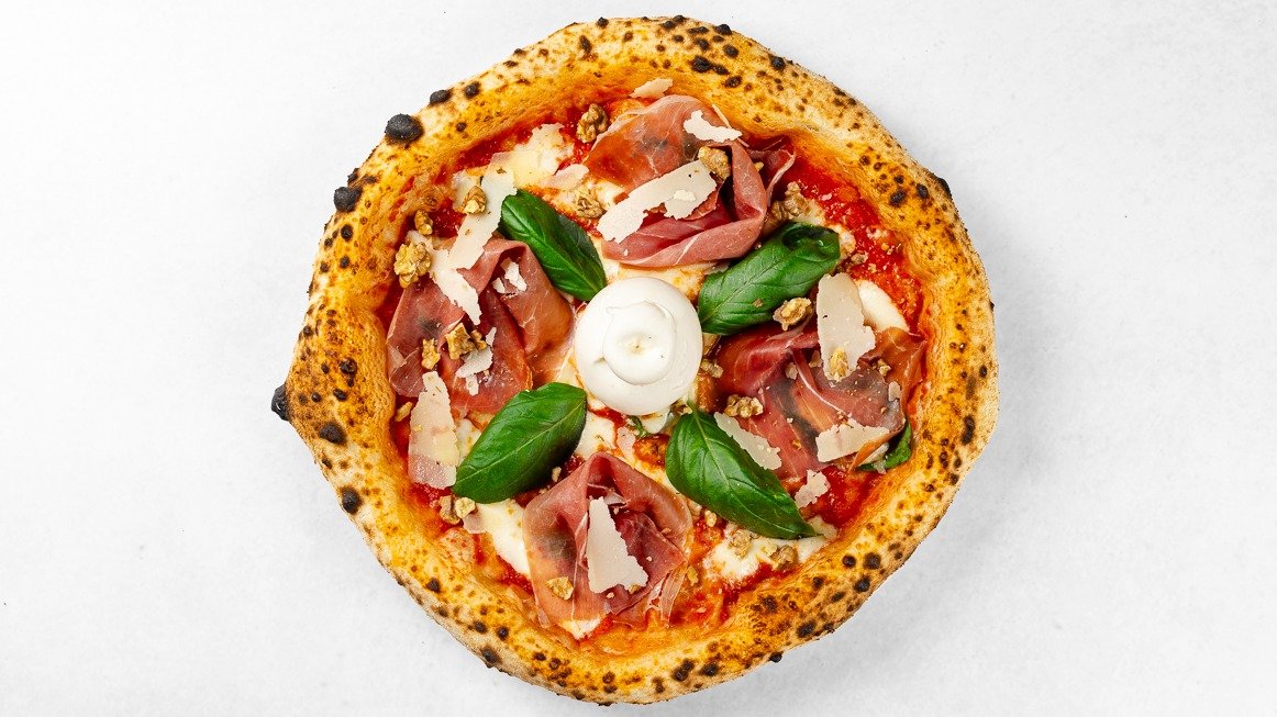 Pelati, fior di latte mozzarella, pršut, Grana Padano, orehi, burratina, olivno olje, bazilika V ceno jedi je všteto doplačilo 1 eur za biorazgradljivo embalažo