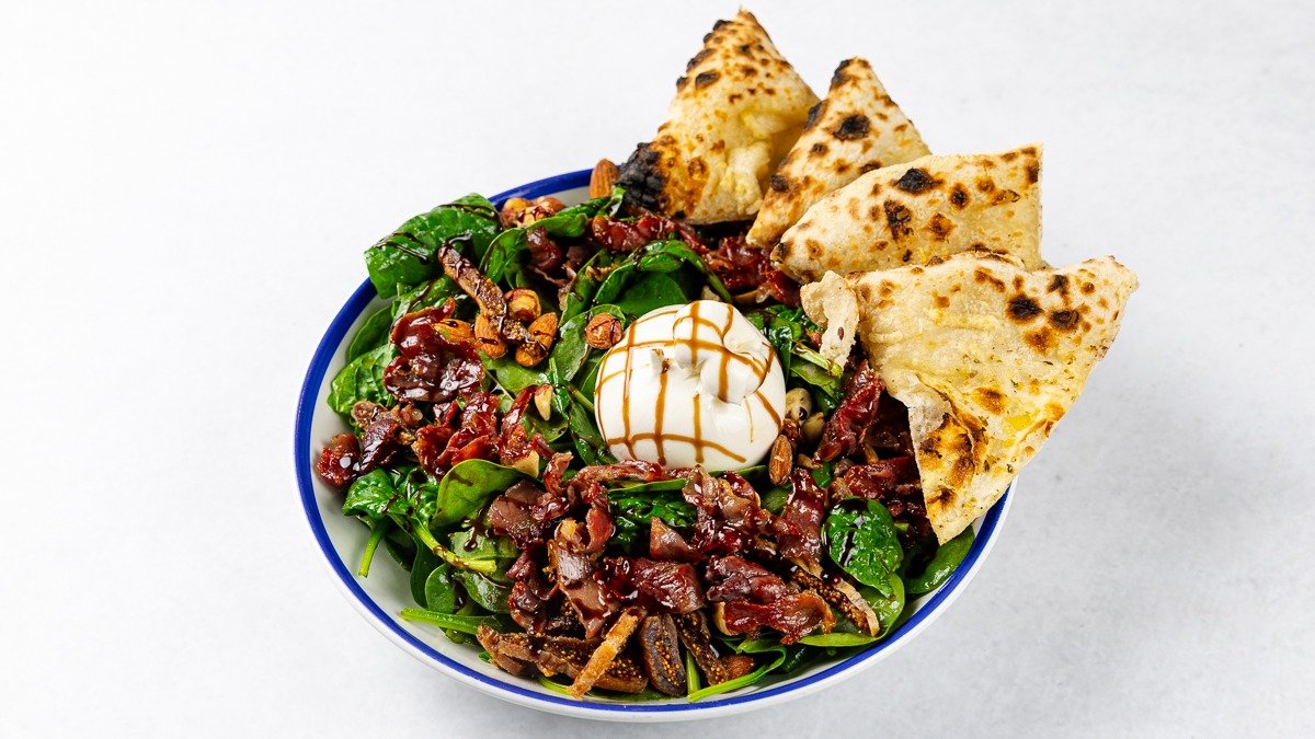 Mlada špinača, burrata, pršut, balzamični preliv, oreščki, domača focaccia V ceno jedi je všteto doplačilo 0.60 eur za biorazgradljivo embalažo