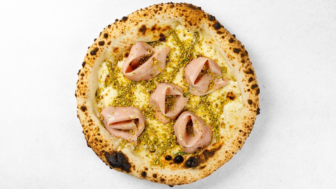 Fior di latte mozzarella, mortadela, pistacije, krema pistacije, bazilika, olivno olje, parmezan V ceno jedi je všteto doplačilo 1 eur za biorazgradljivo embalažo