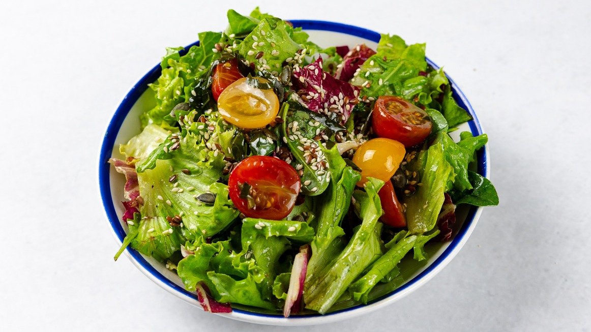 Mešane listnate solate, semena, češnjevi paradižniki, hišni preliv V ceno jedi je všteto doplačilo 0.60 eur za biorazgradljivo embalažo