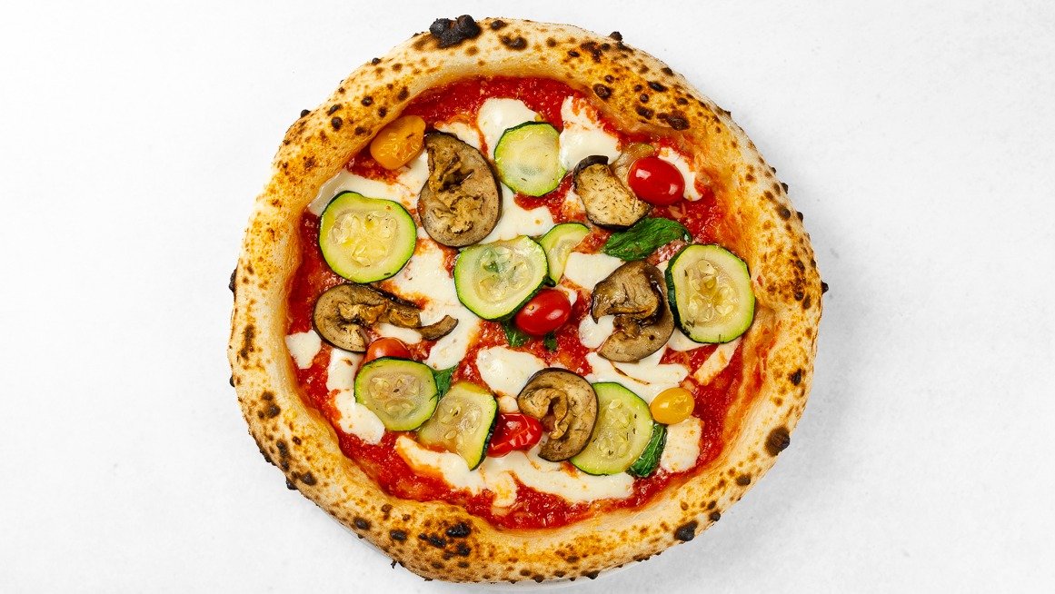 Pelati, fior di latte mozzarella, marinirani jajčevci, bučke na žaru, parmezan, pomodorini, bazilika, olivno olje V ceno jedi je všteto doplačilo 1 eur za biorazgradljivo embalažo