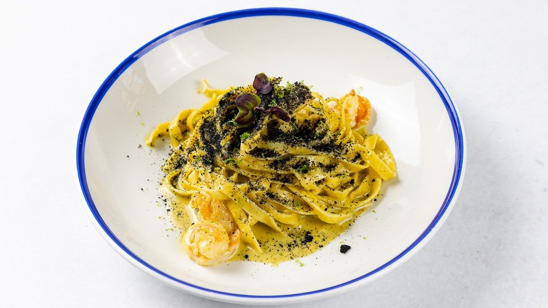 Pasta, kozice, pistacija, limeta, drobtine sipinega črnila V ceno jedi je všteto doplačilo 0.60 eur za biorazgradljivo embalažo