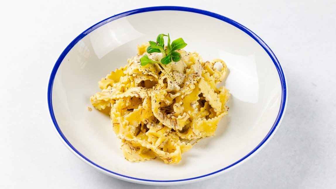 Tajarin piemontesii, guanciale, jajce, parmezan, pecorino, poper V ceno jedi je všteto doplačilo 0.60 eur za biorazgradljivo embalažo