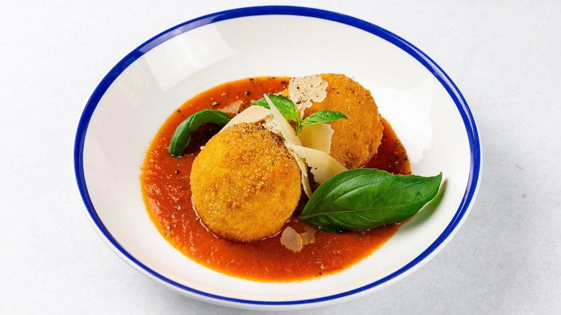 Hrustljavo ocvrta riževa kroglica, polnjena z mesnim ragujem in mozzarello, omaka svežih paradižnikov V ceno jedi je všteto doplačilo 0.60 eur za biorazgradljivo embalažo
