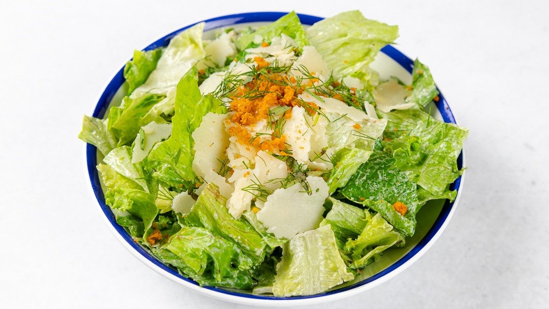 Romanska solata, cezarjev preliv, parmezan, koper, crumble V ceno jedi je všteto doplačilo 0.60 eur za biorazgradljivo embalažo