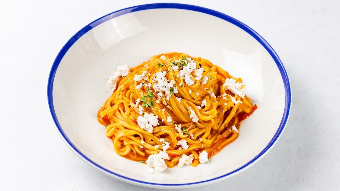 Fettuccine, Poper special omaka, sofrito, sušeni češnjevi paradižniki, parmezan V ceno jedi je všteto doplačilo 0.60 eur za biorazgradljivo embalažo