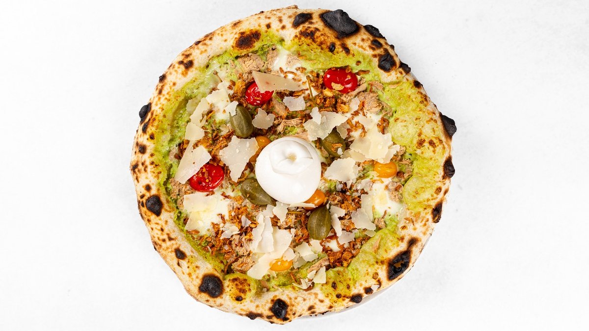 Zelena krema, Mozzarella di Bufala, tuna, češnjevi paradižniki, kapre, burrata, ocvrta čebula, origano, Grana Padano, ekstra deviško olivno olje V ceno jedi je všteto doplačilo 1 eur za biorazgradljivo embalažo