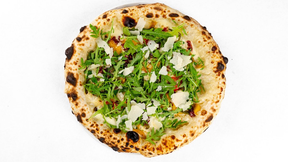 Grana Padano krema, Mozzarella di Bufala, pečena paprika, sušeni paradižniki, česen, rukola, bazilika, Grana Padano, ekstra deviško olivno olje V ceno jedi je všteto doplačilo 1 eur za biorazgradljivo embalažo