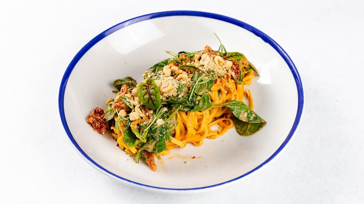 Tajarin piemontesi, nduja, rikota, sušeni paradižniki, mlada špinača, praženi lešniki V ceno jedi je všteto doplačilo 0.60 eur za biorazgradljivo embalažo