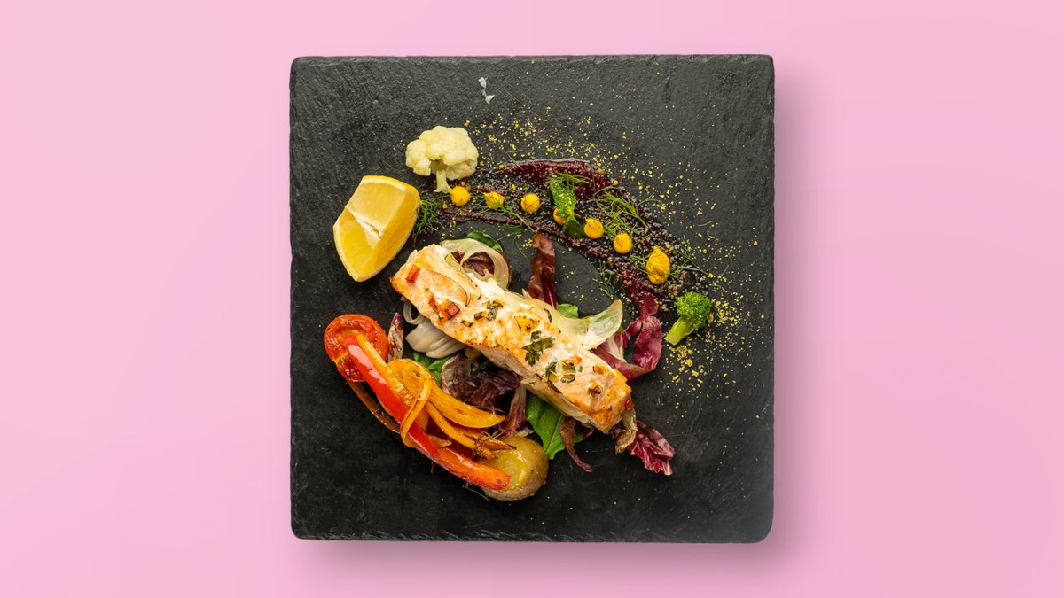 Fileto salmoni e pjekur me susam, shoqëruar me perime të pjekura.