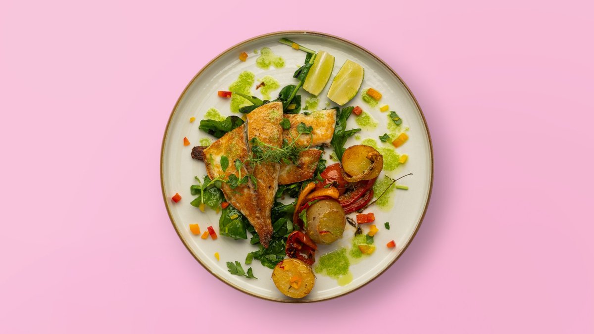 Pakeri të freskëta me copa peshku të pjekur, shoqëruar me salcë të lehtë agrume & vaj ulliri.
