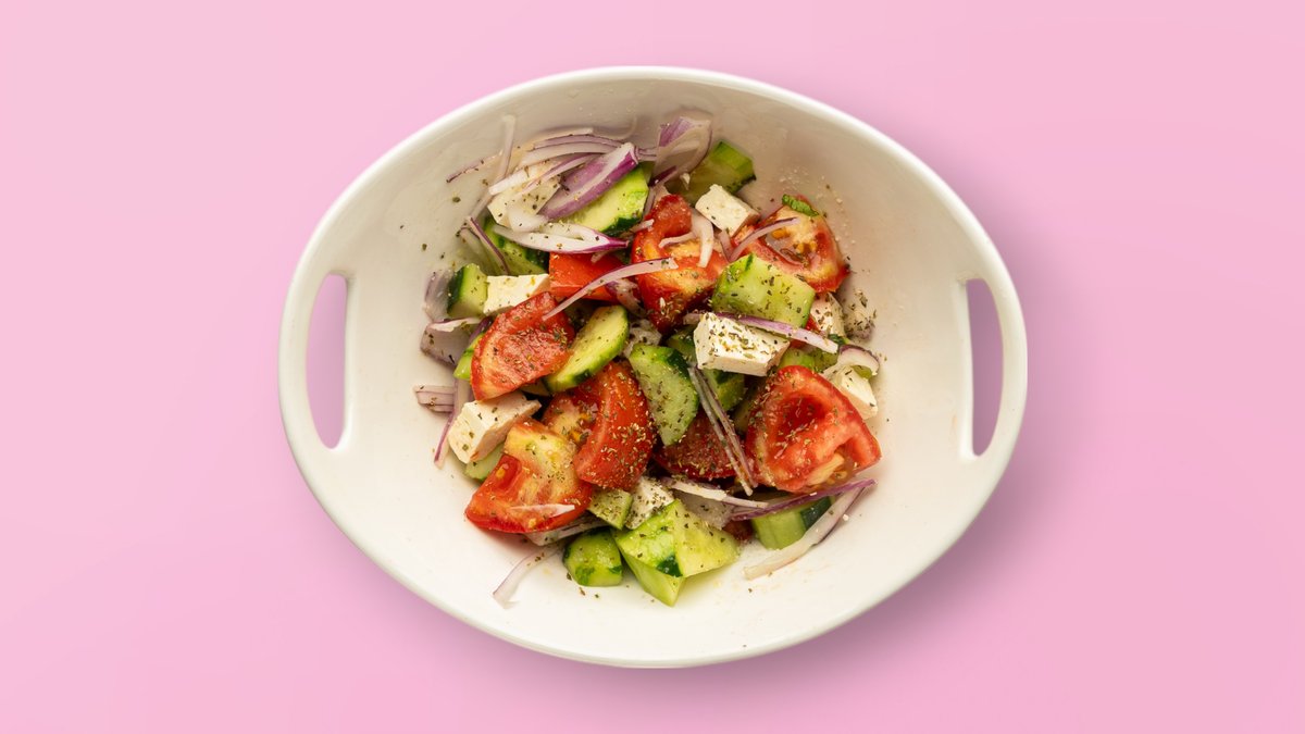 Me domate, kastravec, qepë të kuqe, ullinj kalamata, djathë feta & vaj ulliri ekstra të virgjër