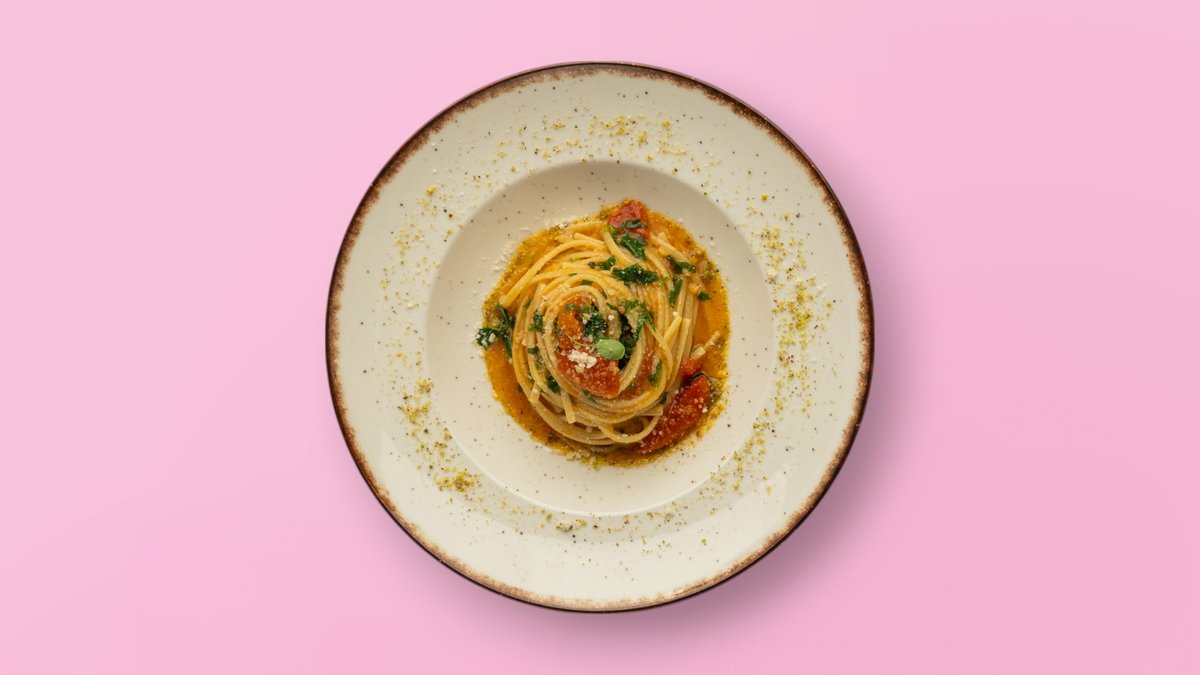 Linguine të freskëta me salcë domatesh të freskëta, borzilok aromatik dhe një spërkatje vaj ulliri ekstra të virgjër.