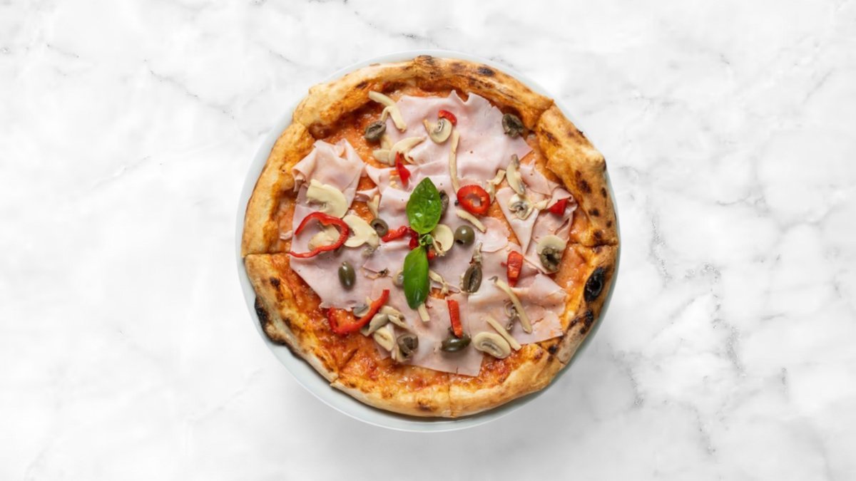 Salcë, mozzarella, proshutë, spec, kërpudha, ullinj