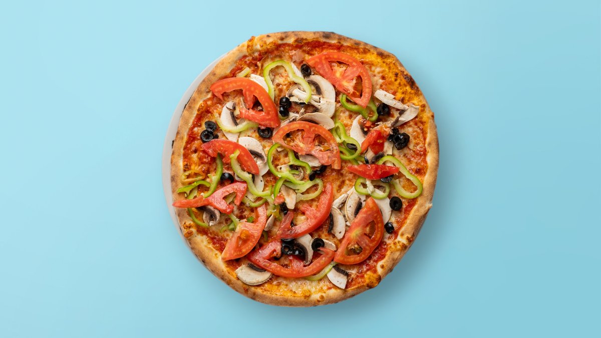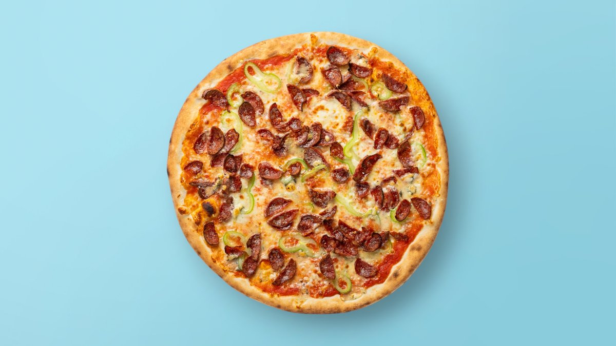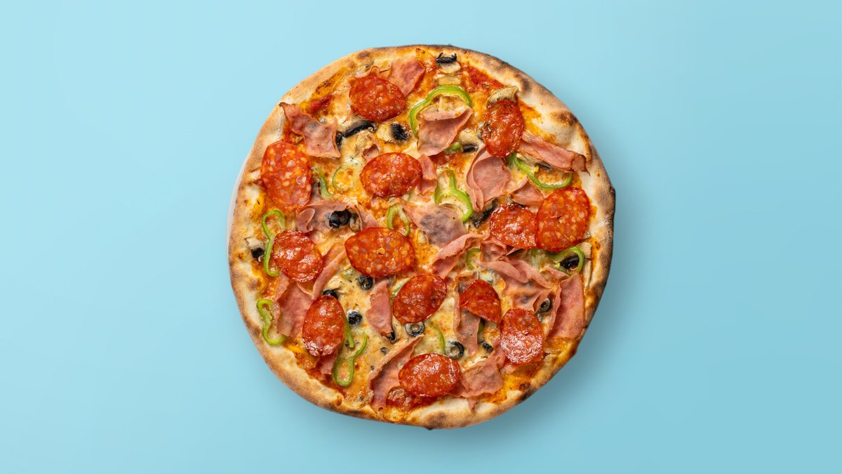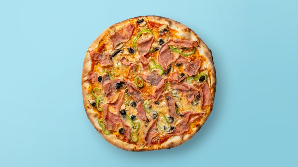 Salcë, mozzarella, kërpudha, proshutë, speca, ullinj