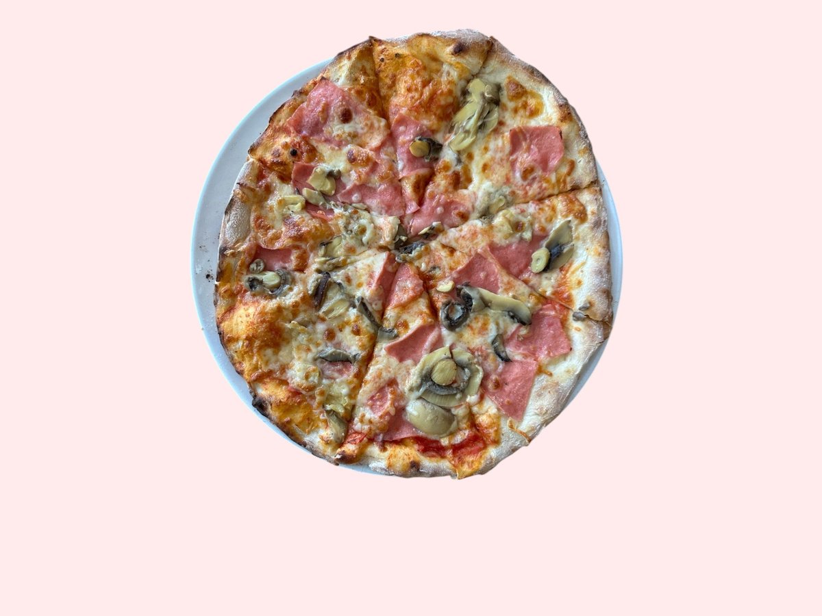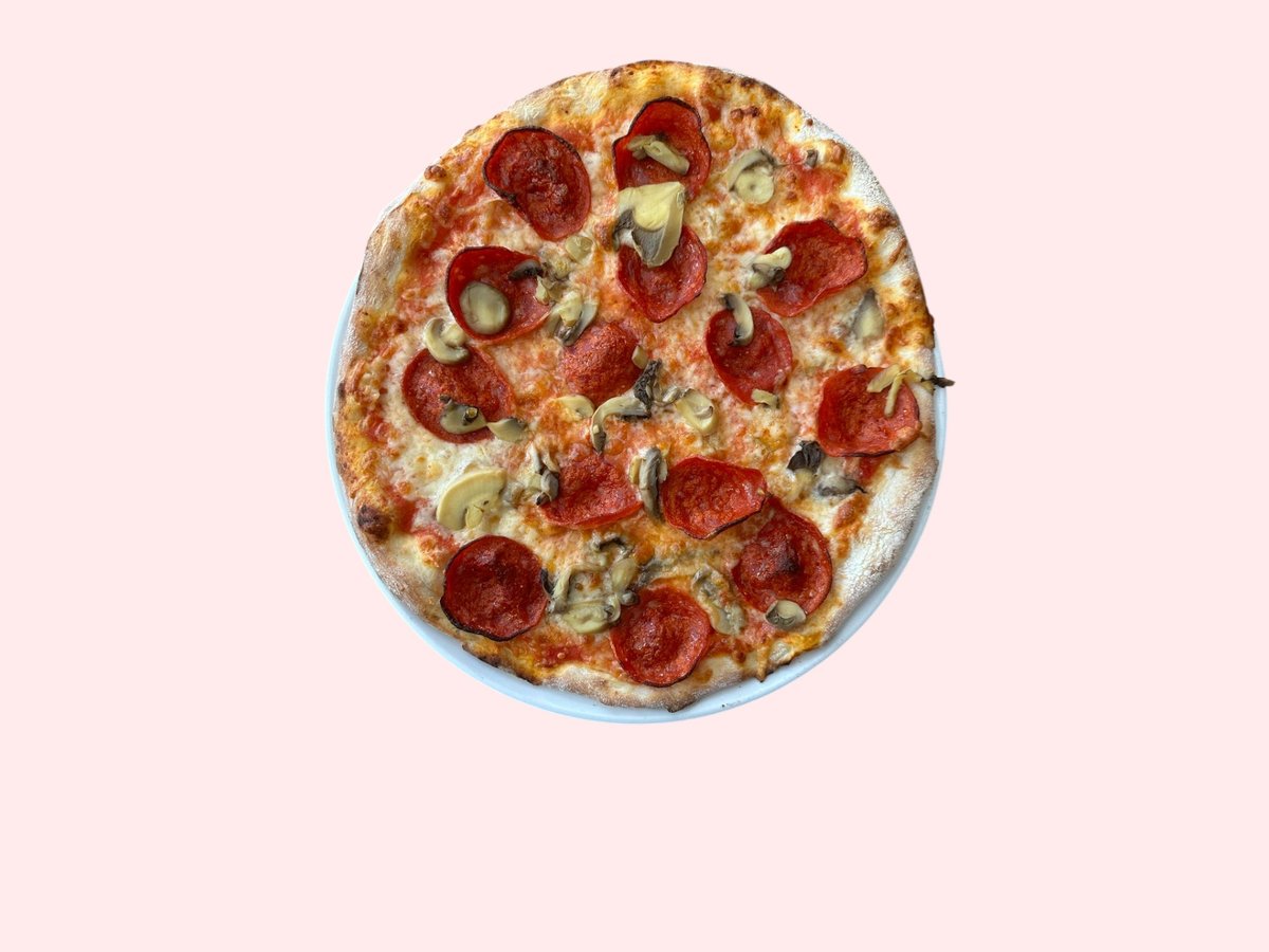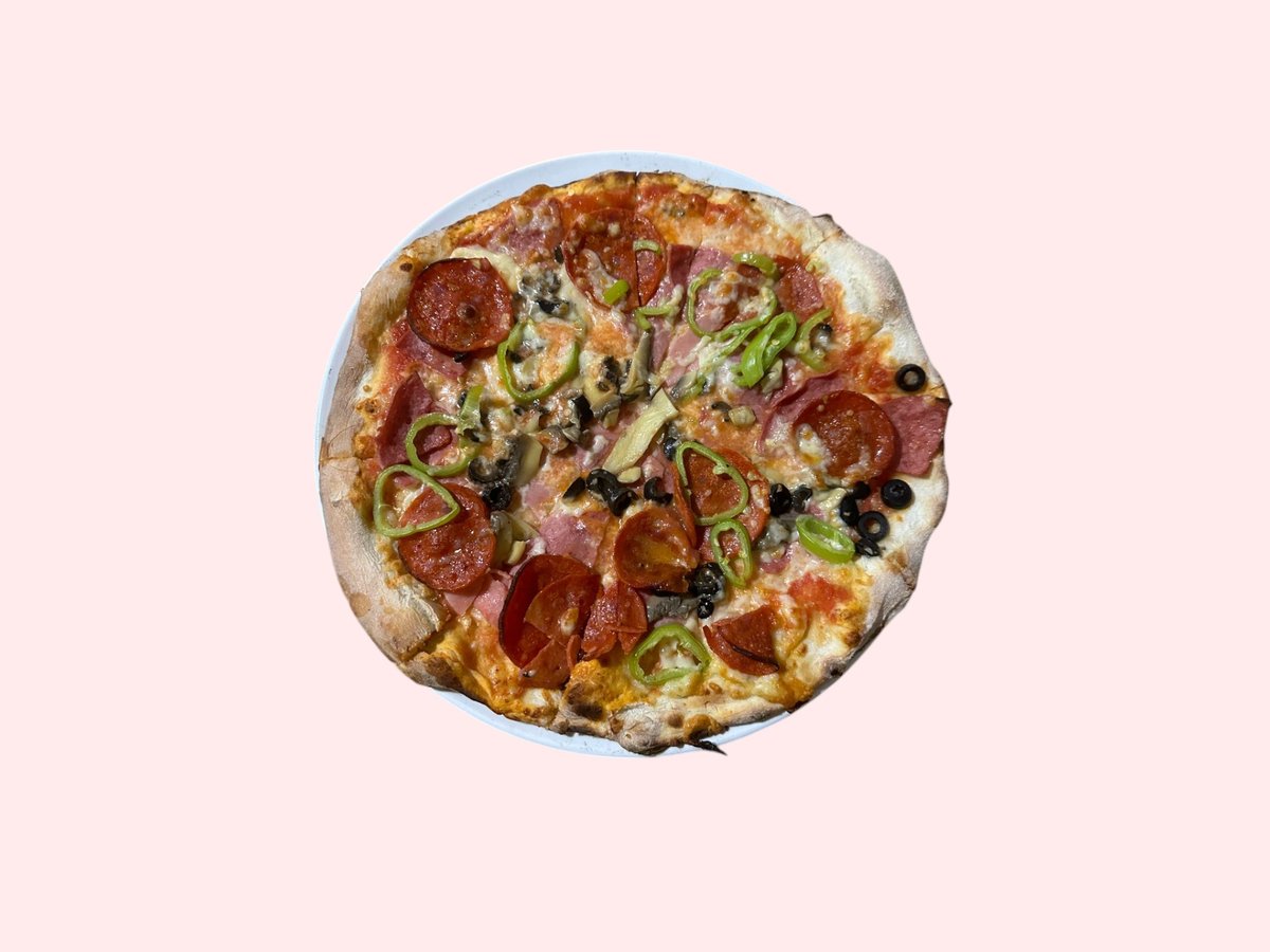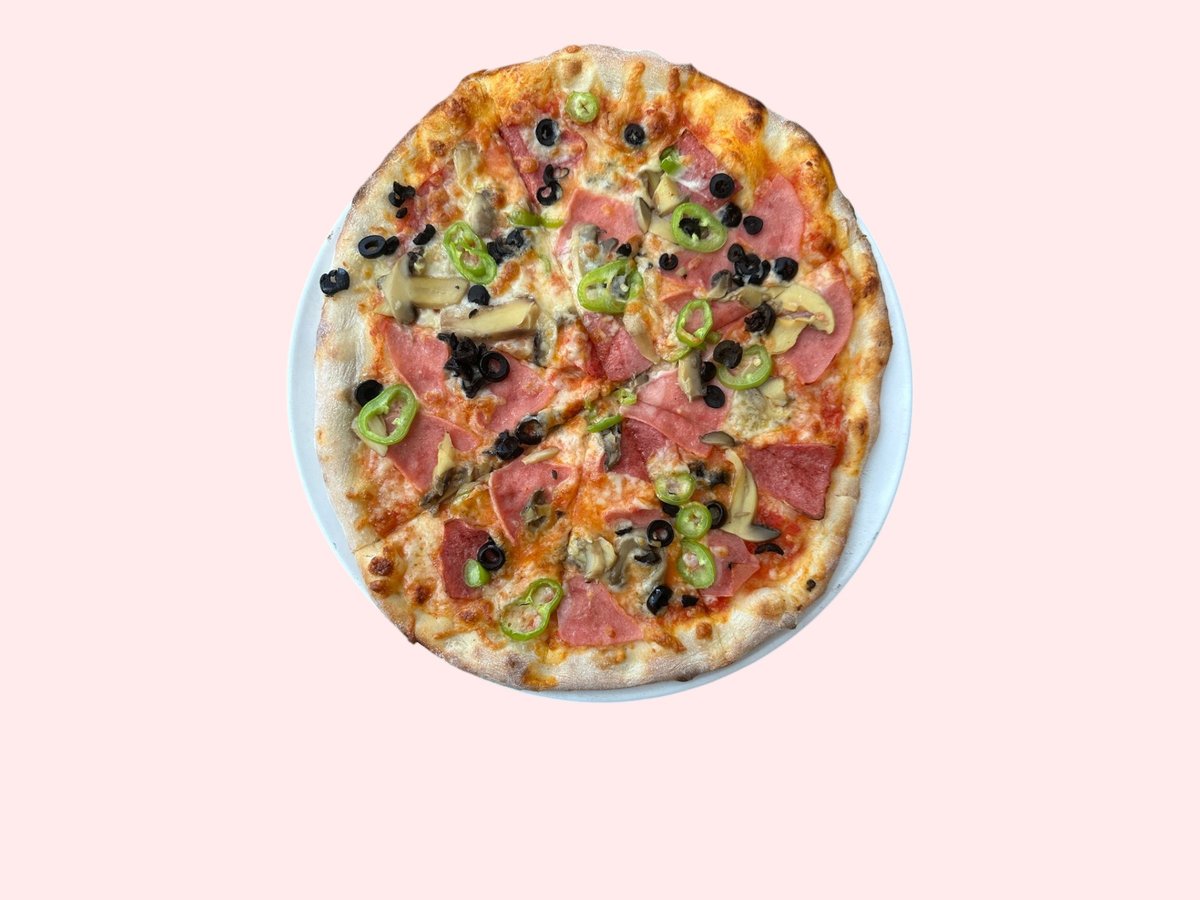 Salcë, mozzarella, proshutë, sallam pikant, kërpudha, ullinj, speca