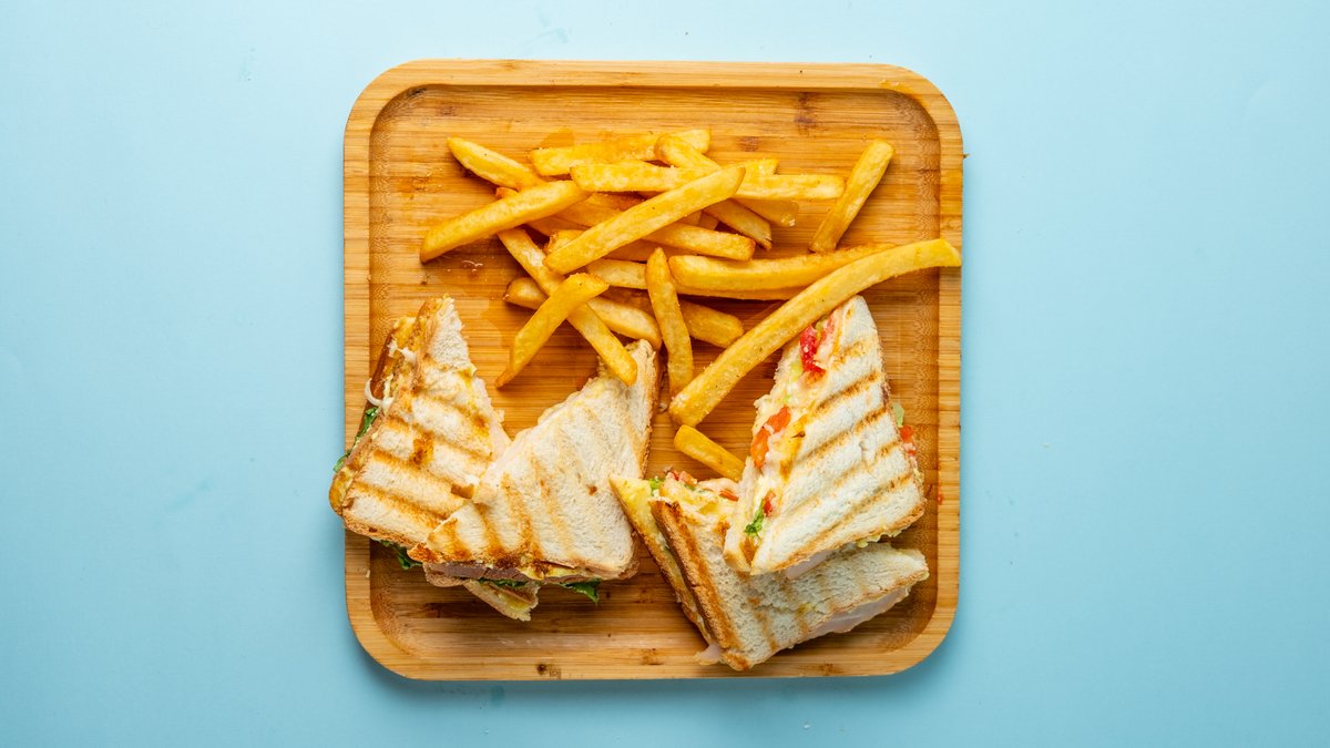 Fileto pule, djathë cheddar, sallatë jeshile, kastravec turshi, salca jonë e shtepisë, patate frite