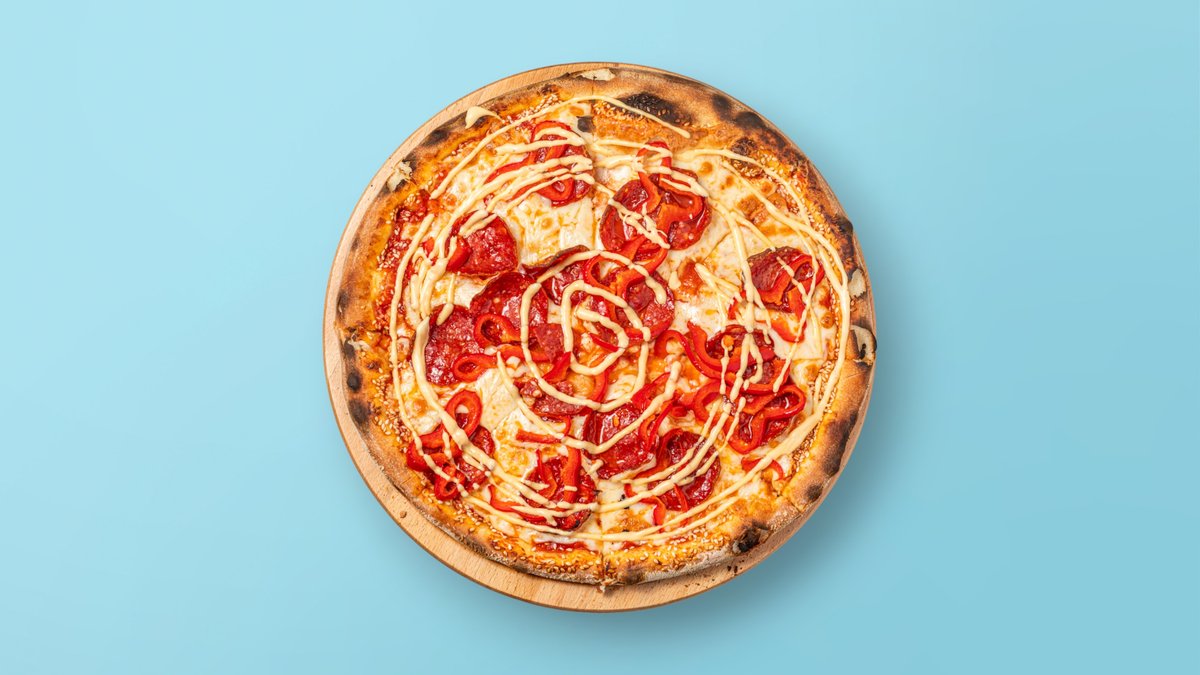 Domate, mozzarella, sallam pikant, speca, salcë pikante