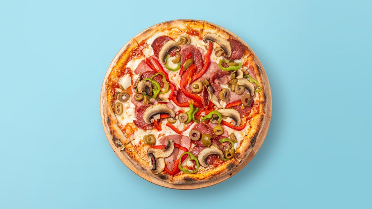 Domate, mozzarella, proshutë, sallam, ullinj, speca, kërpudha