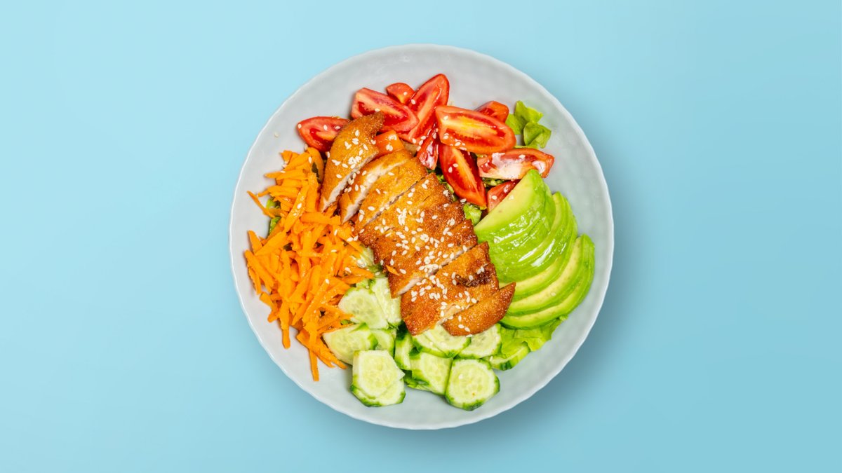 Sallatë jeshile, karrota, domate, kastraveca, avocado, pulë