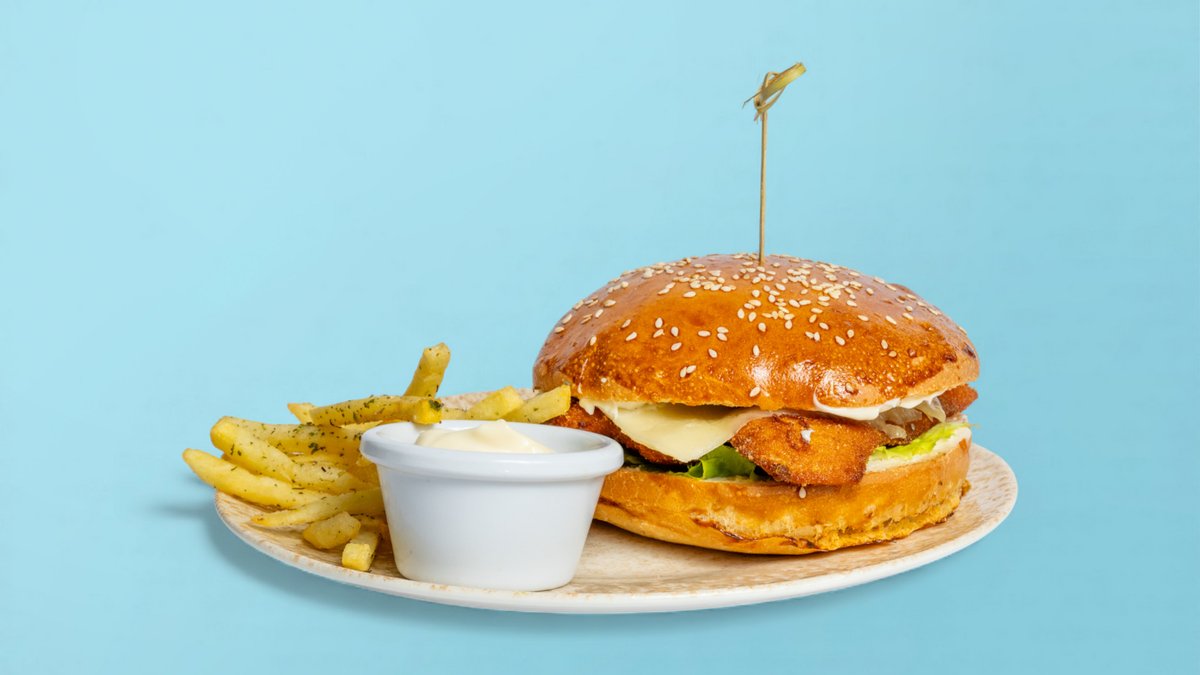 Fileto pule, vezë, djathë, turshi, salcë agrodolce, sallatë, patate