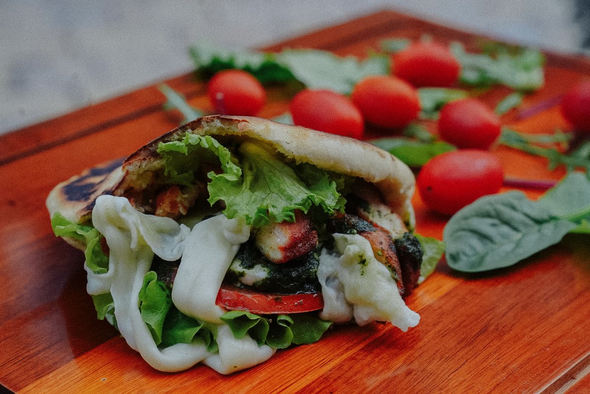 Bukë në formë pite nga kuzhina jonë, sallatë,domate,kastraveca,salce pesto, pulë
