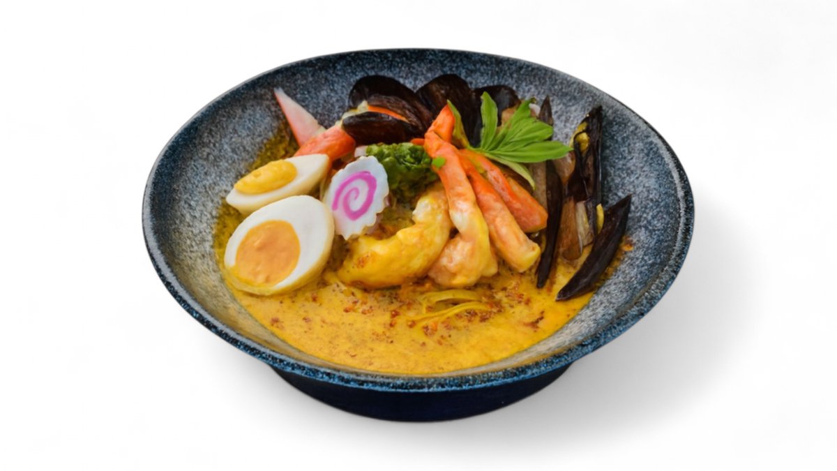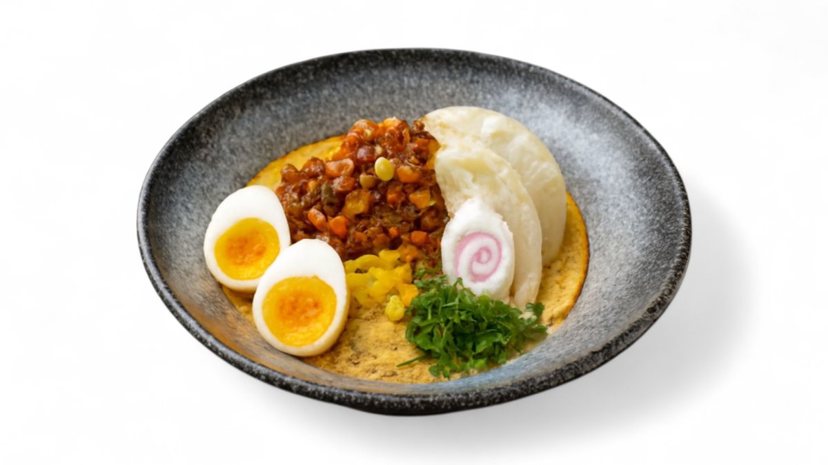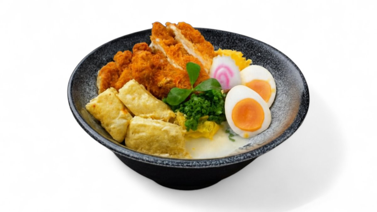 Lëng shio, pulë katsu, tofu, misër, qepë e njomë, qofte peshku, vezë e zier