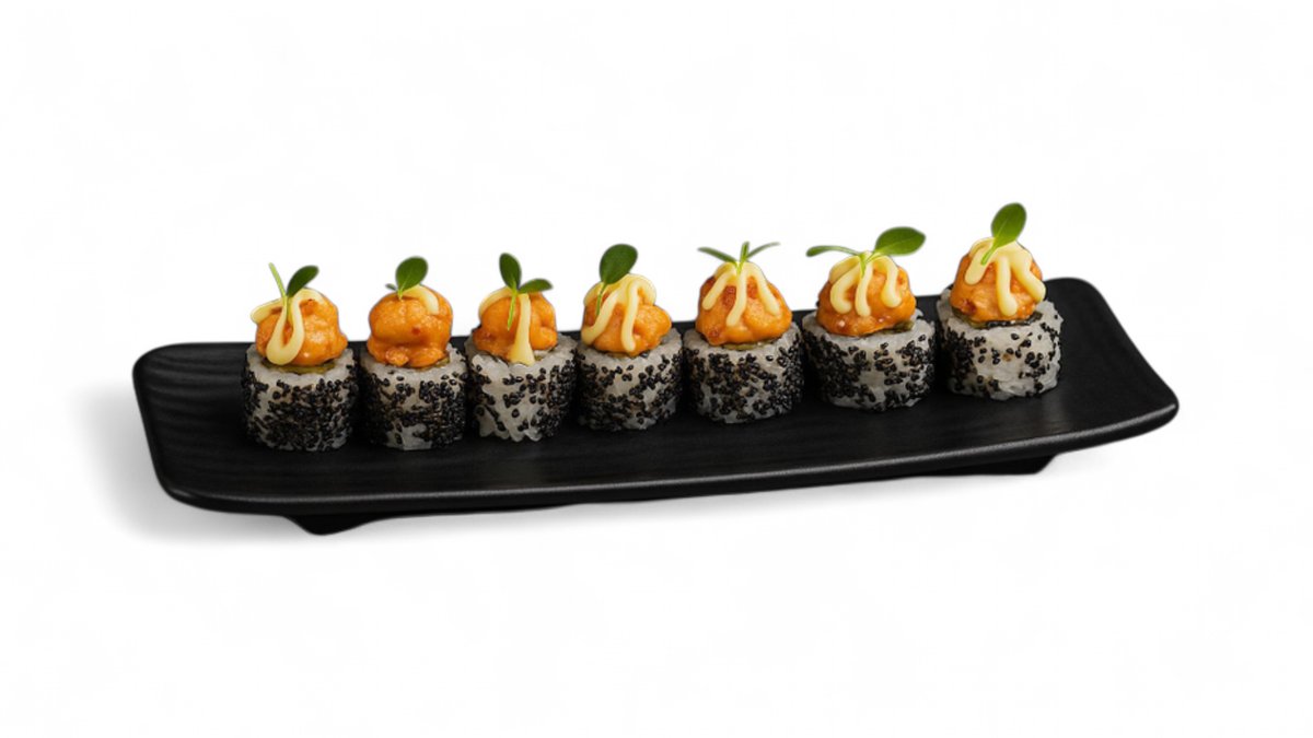 Salmon, karkaleca, avokado, tobiko, majonezë gaforre, salcë teriyaki (8 copë)