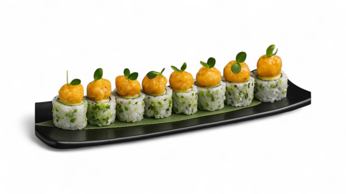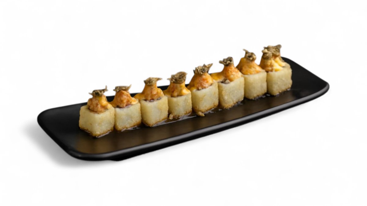 Karkaleca tempura, avokado, patate krokante, kastravec, majonezë pikante, salcë teriyaki (8 copë)