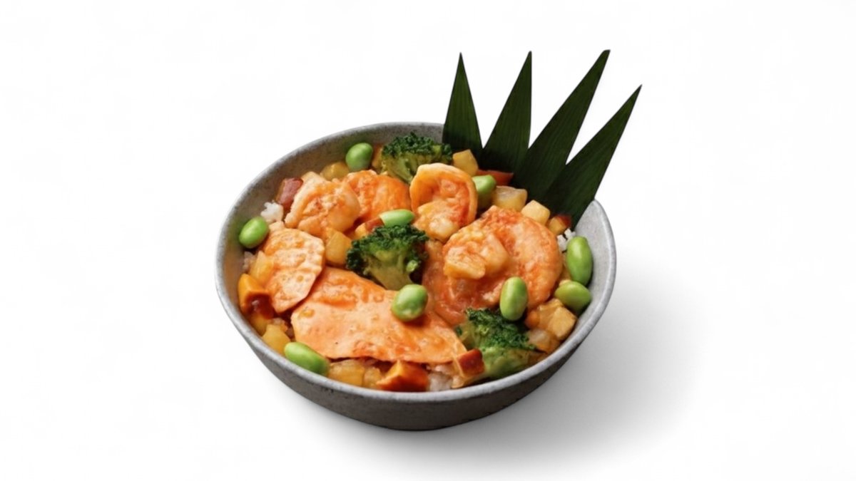 Karkaleca, oriz, salcë teriyaki, perime