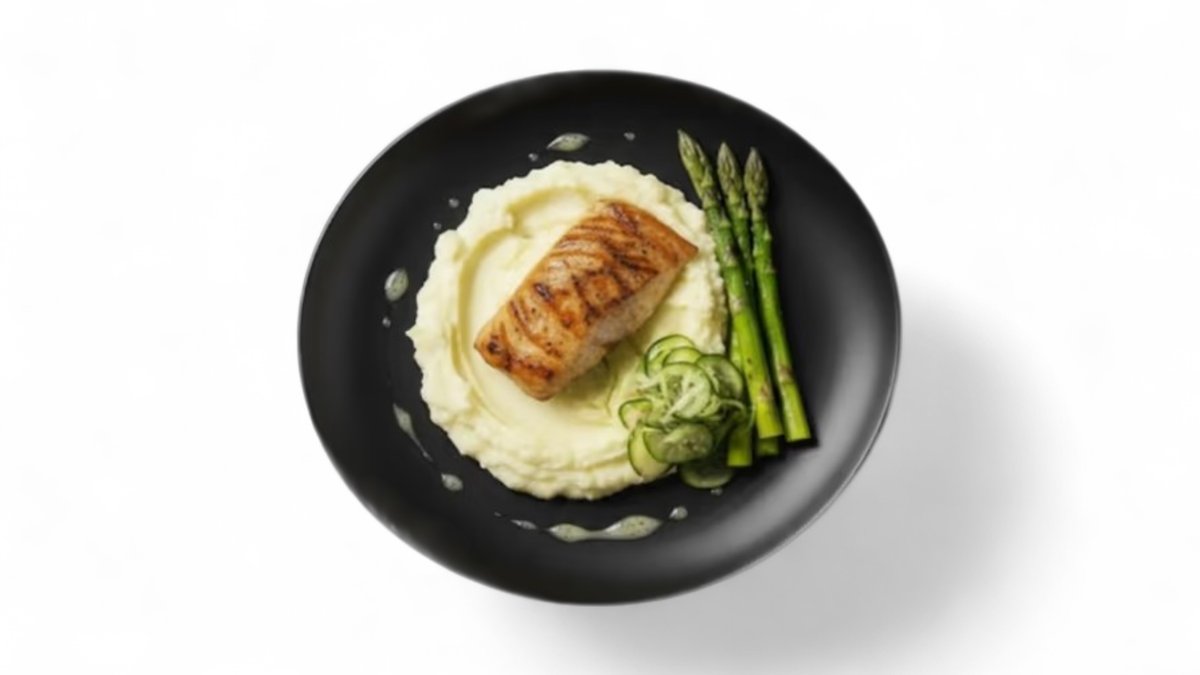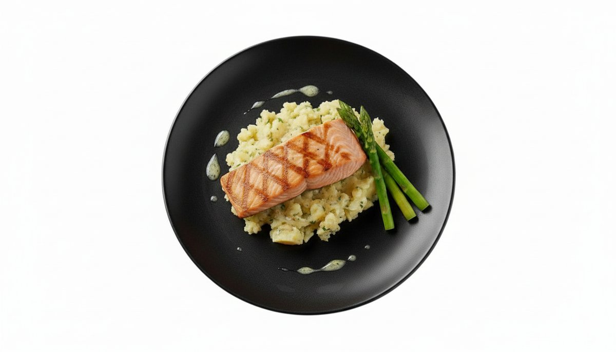 Salmon i pjekur në skarë, patate pure, vaj ulliri, asparag