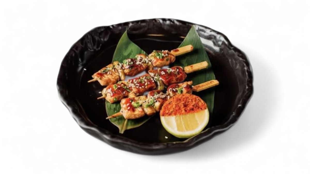 Pulë e pjekur në skarë e marinuar, shërbyer me salcë robata