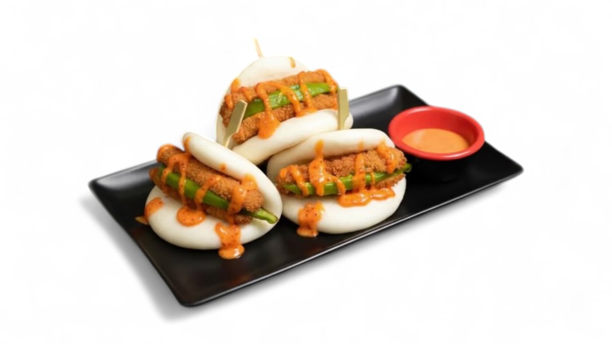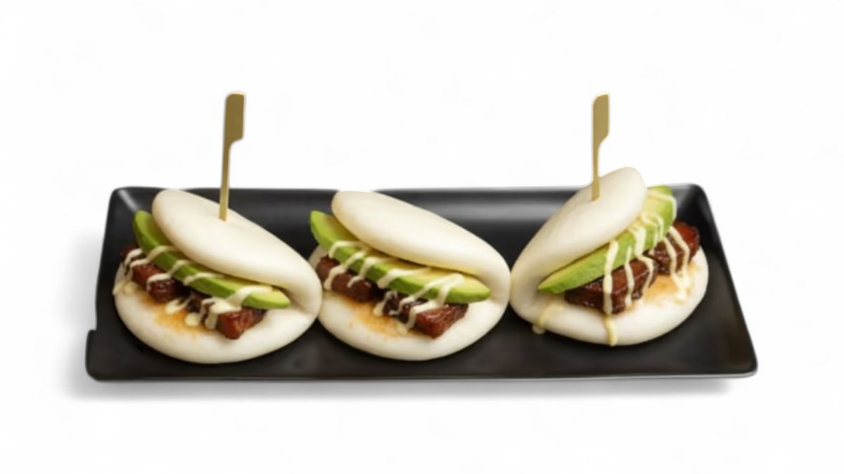 Bao buns të ziera me pulë krokante të artë, avokado, salcë vullkan, majonezë pikante