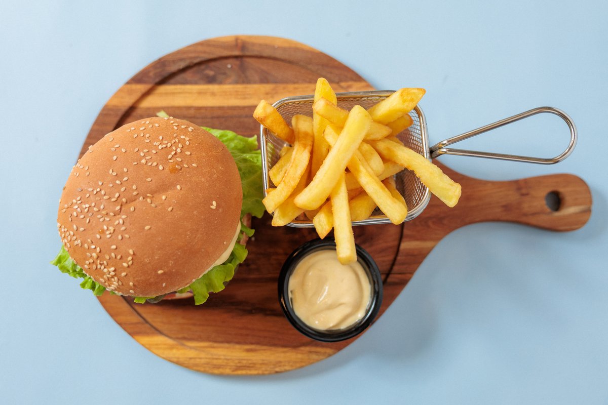 Qofte viçi e përgatitur nga ne, patate, sallatë, domate, qepë, salcë burgeri, kastraveca turshi, djathë gorgonzola, djathë guda