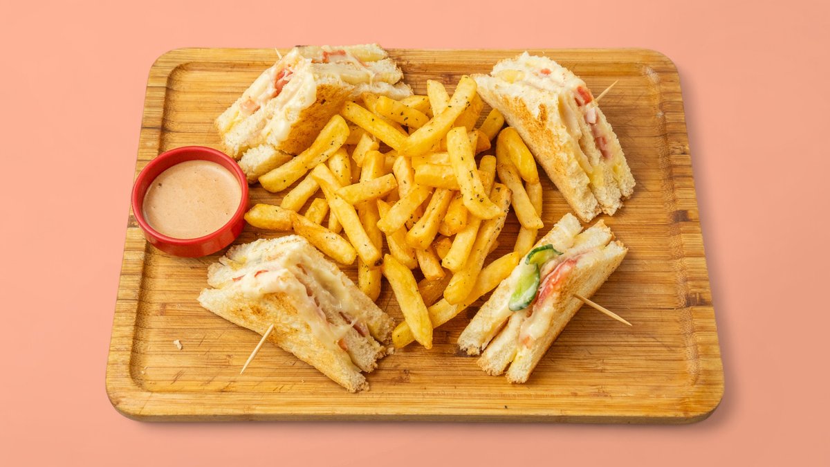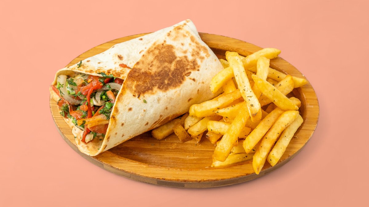 2 qofte viçi shtëpie, 2 djath, domate, kastravec turshi, sallatë, patate