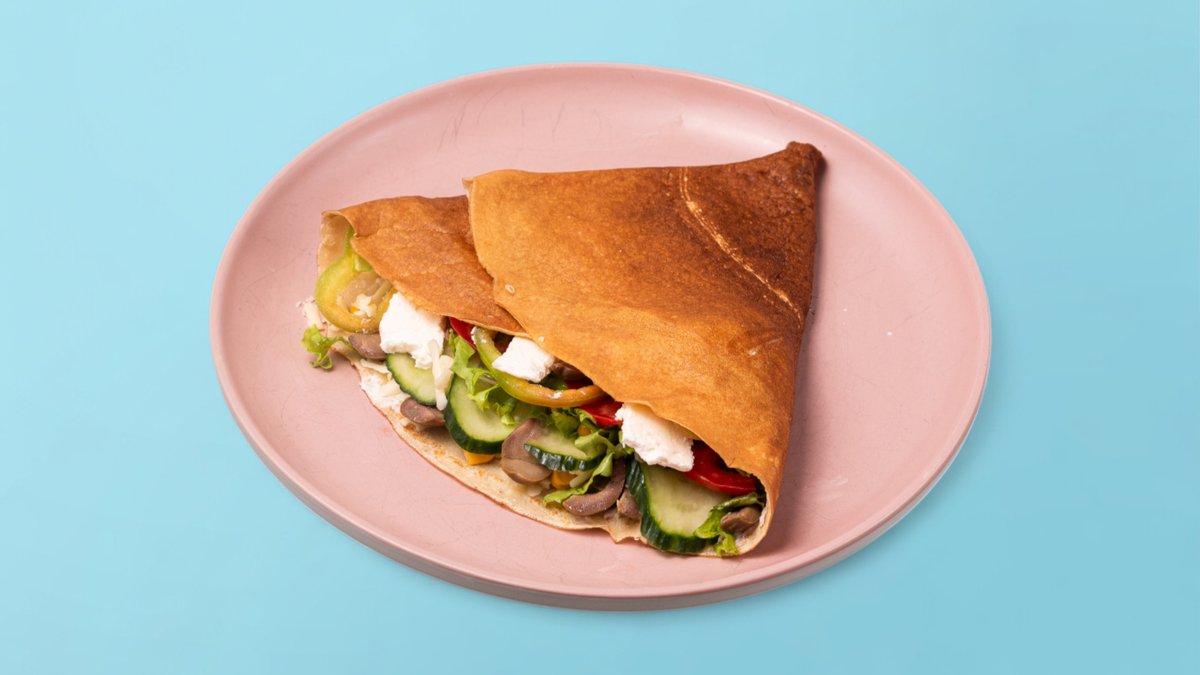 Djathë gouda, djathë i bardhë, domate, kastravec, sallatë jeshile, speca, ullinj, rigon, krem djathi