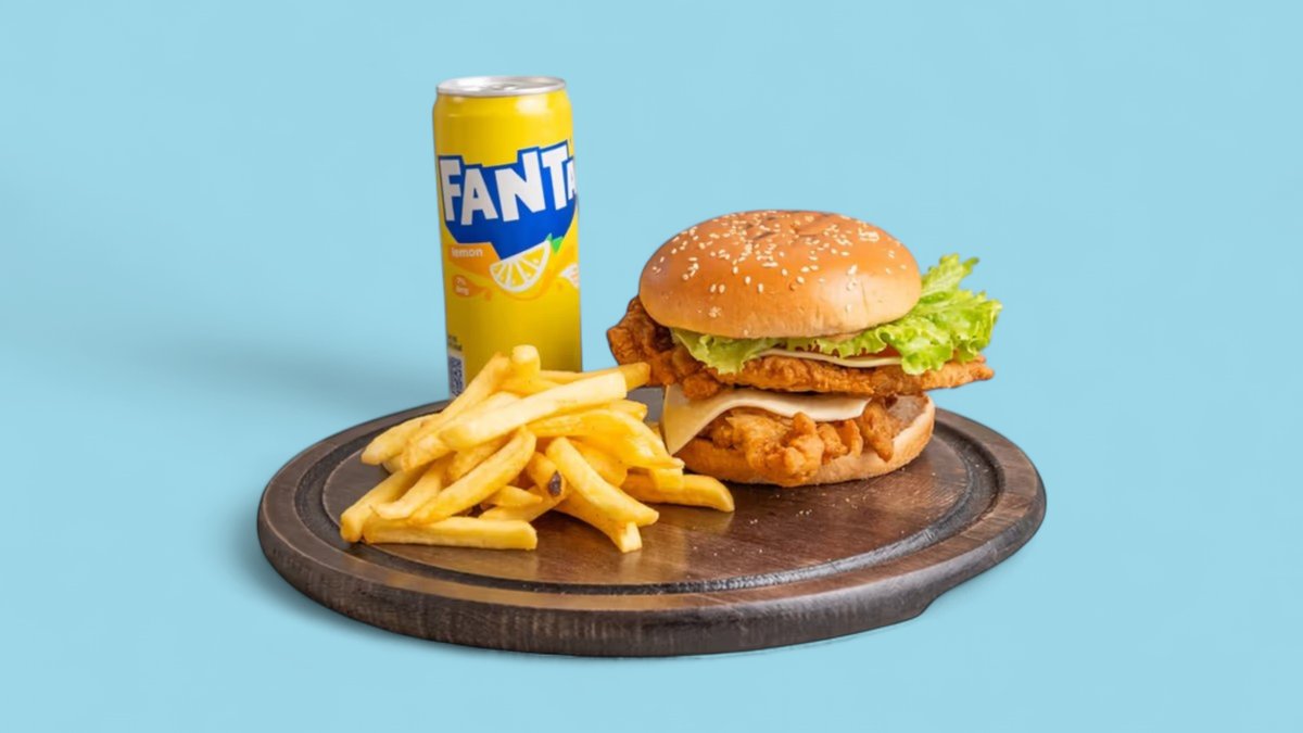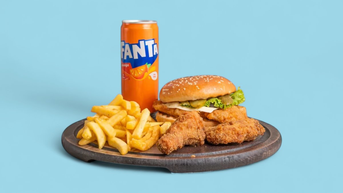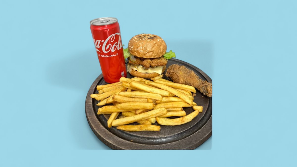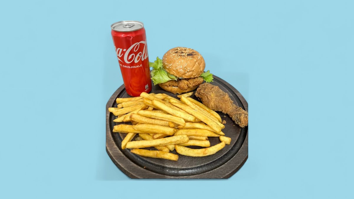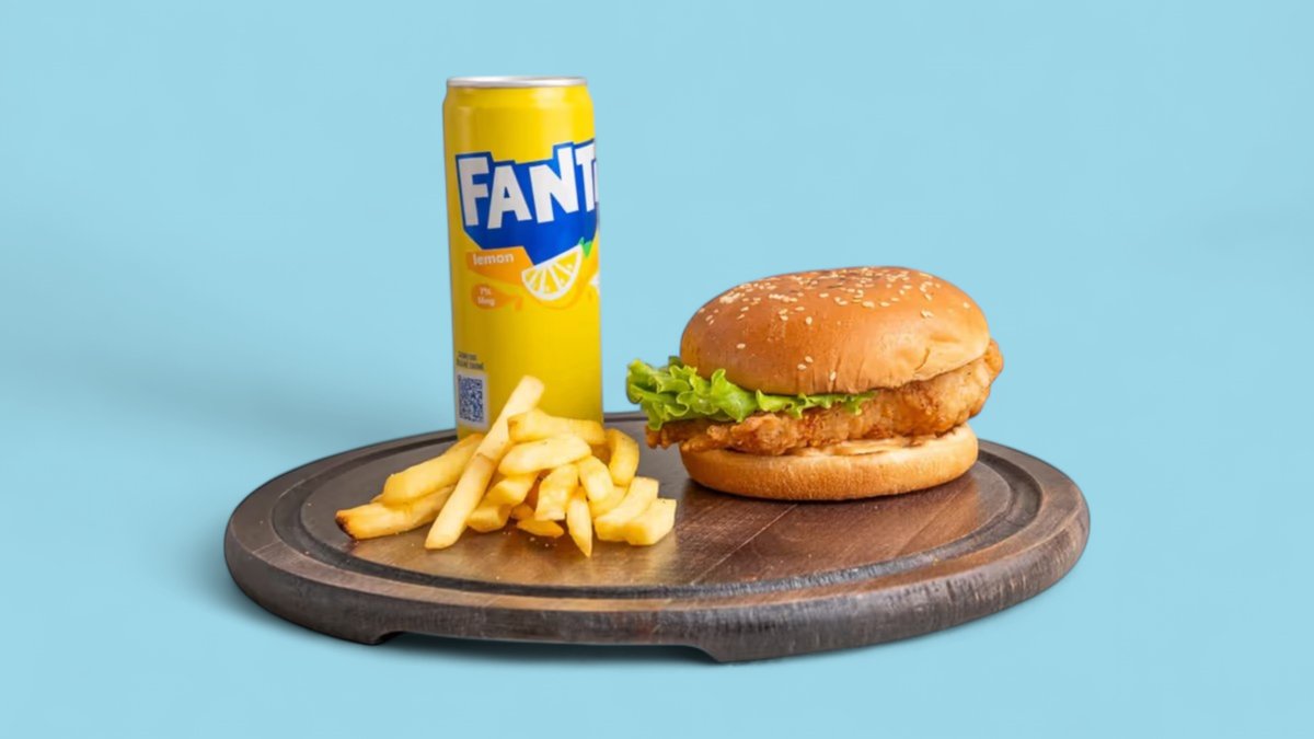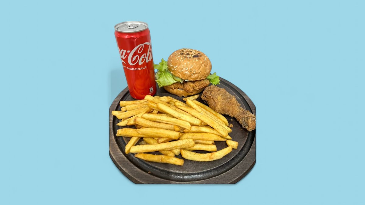 Fillet burger, 2 wings or 1 drumstick, chips, drink