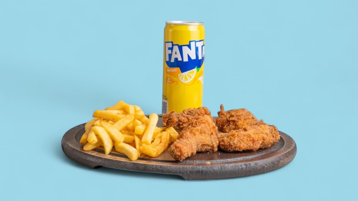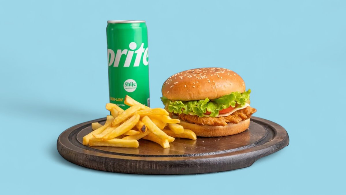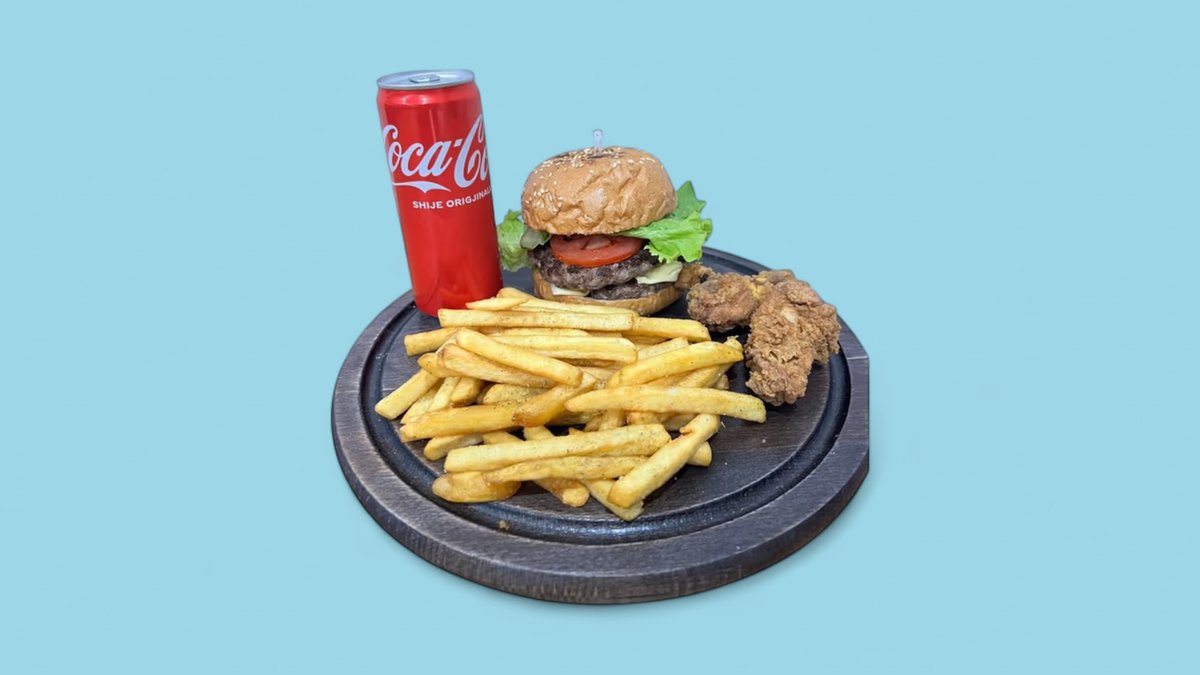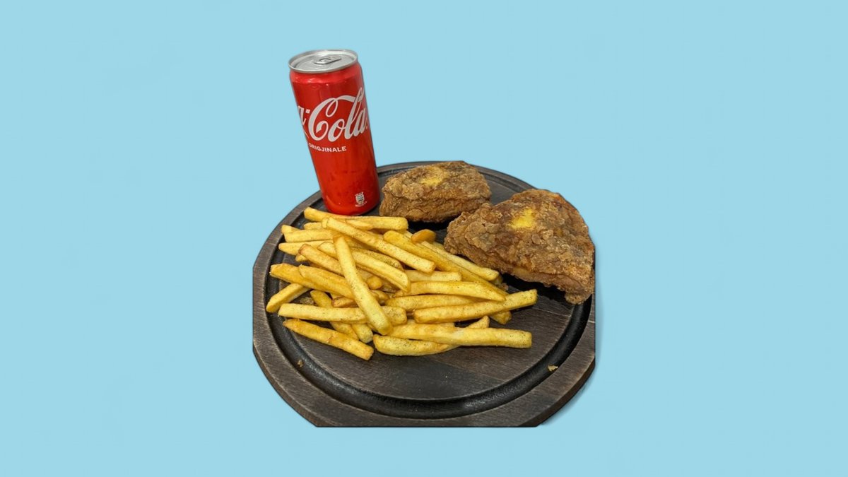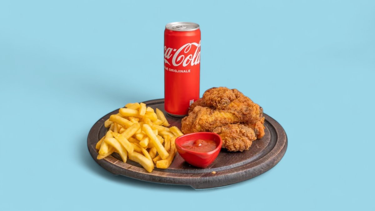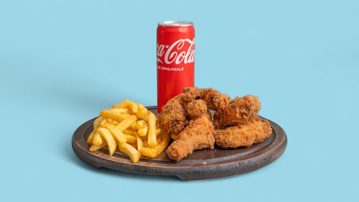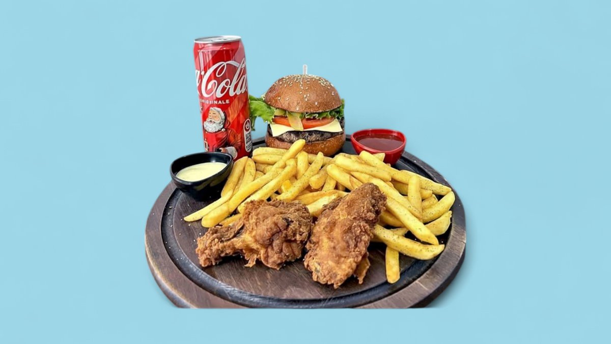Fillet burger, 2 wings or 1 drumstick, chips, drink